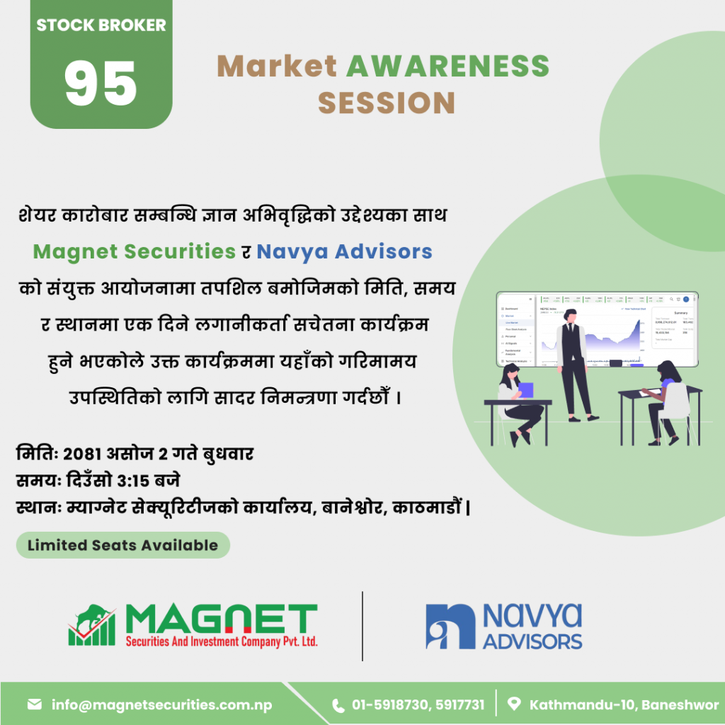 शेयर कारोबार सम्बन्धि ज्ञान अभिवृद्धिको उद्देश्यका साथ यस म्याग्नेट सेक्यूरिटीजको कार्यालयमा एक दिने लगानीकर्ता सचेतना कार्यक्रम हुने भएकोले उक्त कार्यक्रममा यहाँको गरिमामय उपस्थितिको लागि सादर निमन्त्रणा गर्दछौँ ।